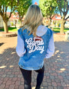 We love a boyfriend style button up denim! This one features grey fleece sleeves and a detachable hood. Two flap pockets and two side pockets, this jean jacket is great for those fall game days! Roomy and relaxed fit. White Game Day sequence football patch featured on the back.