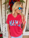 Comfort and effortless style, this Mama American V-Neck Tee is a must this summer! The cutest bright red V-neck featuring a MAMA patriotic design.