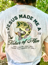 Jesus Made Me A Fisher of Men tee. This tee is a good reminder for us all. Faith and fishing inspired design on a basic grey lightweight tee.
