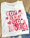 You Are So Loved design featuring bright pink hearts and stars on a clean white tee with John 3:16.